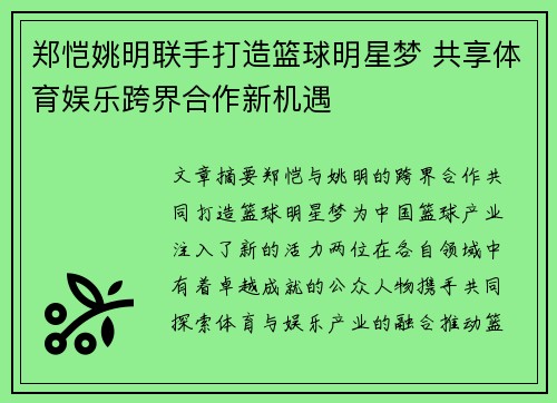 文章摘要:郑恺与姚明的跨界合作,共同打造篮球明星梦,为中国篮球产业注入了新的活力。两位在各自领域中有着卓越成就的公众人物,携手共同探索体育与娱乐产业的融合,推动篮球文化的发展,并为年轻一代的篮球梦想提供平台。在这篇文章中,我们将从四个方面详细探讨郑恺和姚明如何联手打造篮球明星梦,如何借助跨界合作的机...